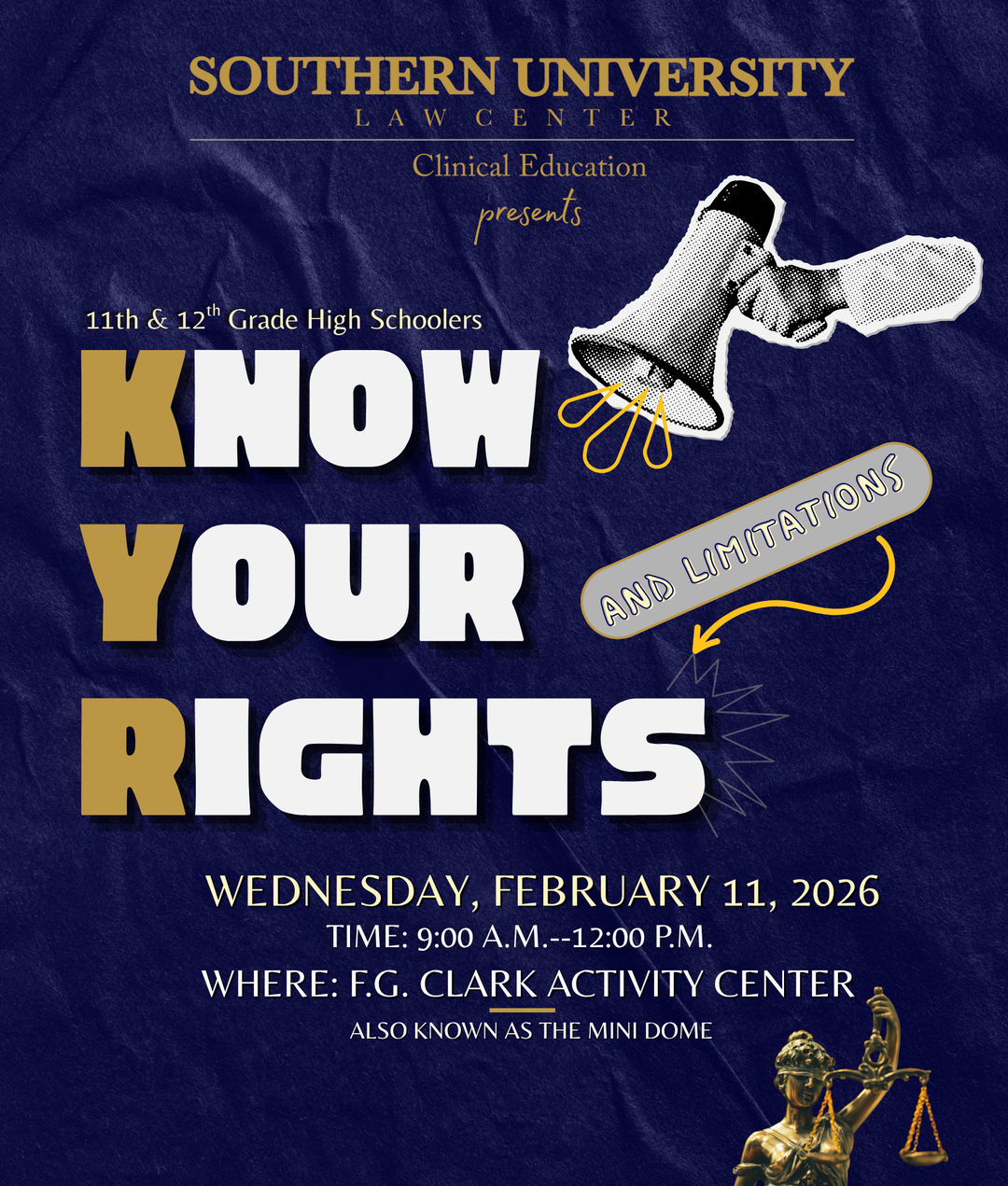 Southern University Law Center’s (SULC) Clinical Legal Education Program will host a Know Your Rights and Limitations workshop for high school students on February 11 at the Southern University F.G. Clark Activity Center. The program will run from 9 a.m. to noon and is designed to equip students with essential knowledge and practical tools for interacting with law enforcement and other authority figures.