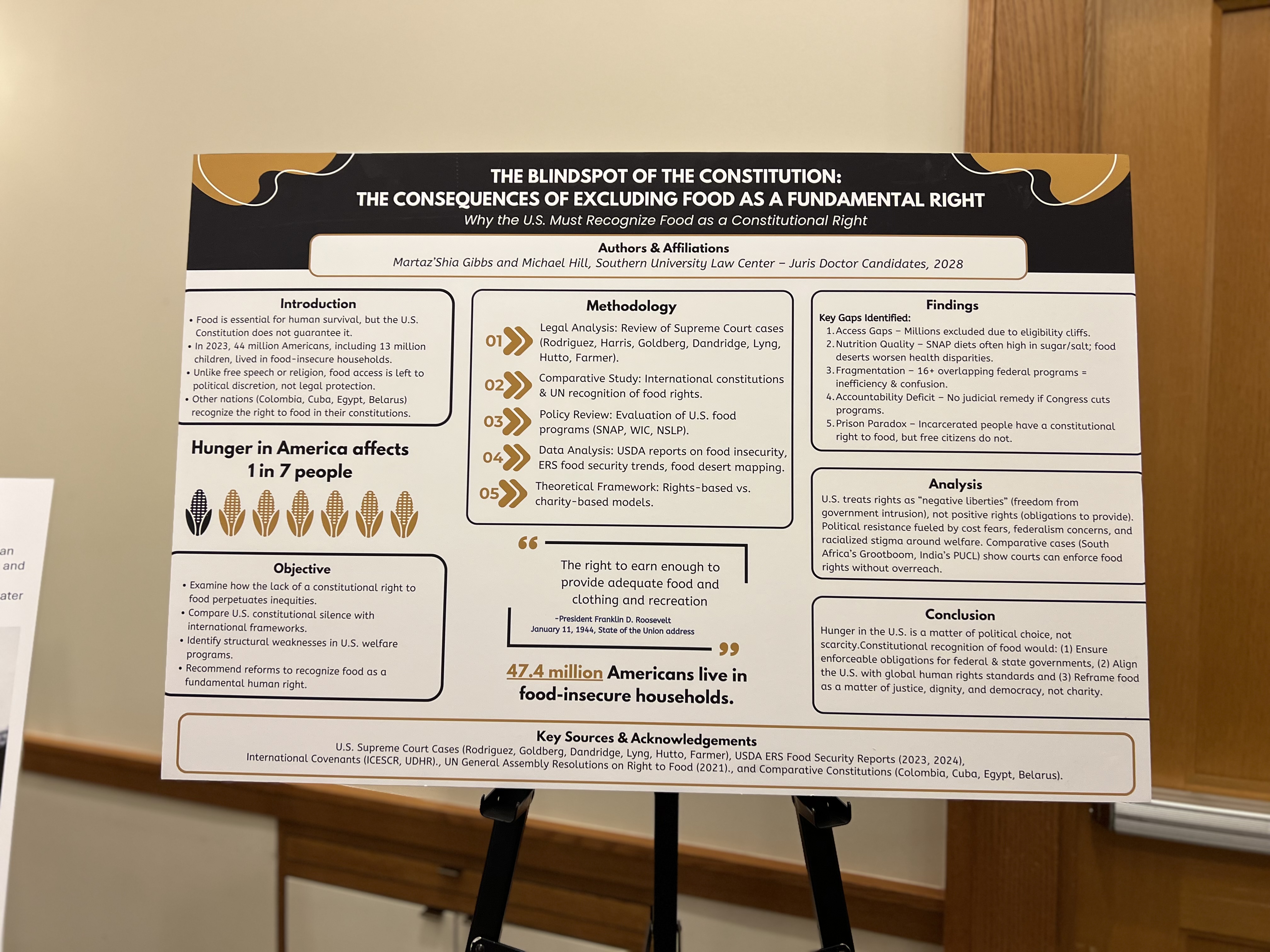Representing SULC, Professor Kimberly H. LaMotte contributed to the national dialogue alongside USDA Risk Management Ambassador Cindy Ayers Elliott, a noted leader in agriculture and community development. SULC students Martaz’Shia Gibbs and Michael Hill also showcased their scholarship through a poster presentation examining the intersection of community health and food access. Their work highlighted the essential connection between legal advocacy and public well-being, illustrating how emerging legal professionals can advance meaningful change at the community level.