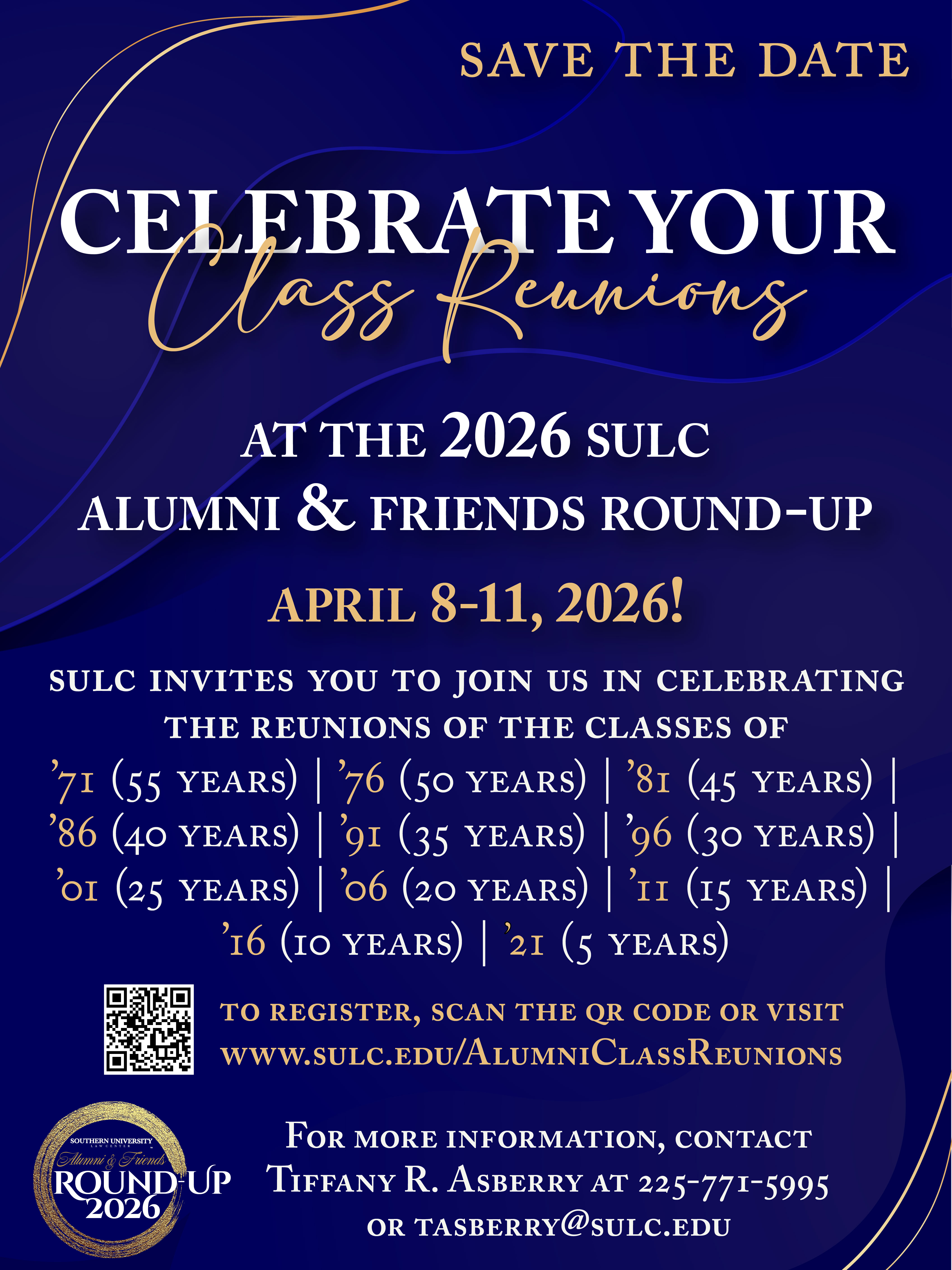 The Southern University Law Center (SULC) proudly invites all alumni to reconnect, reminisce, and celebrate at the 2026 Alumni & Friends Round-Up, taking place April 8–11, 2026. Events include the Unveiling of Legistaive Portraits, Judicial Wall of Fame Unveiling, Hall of Fame Gala, and more.