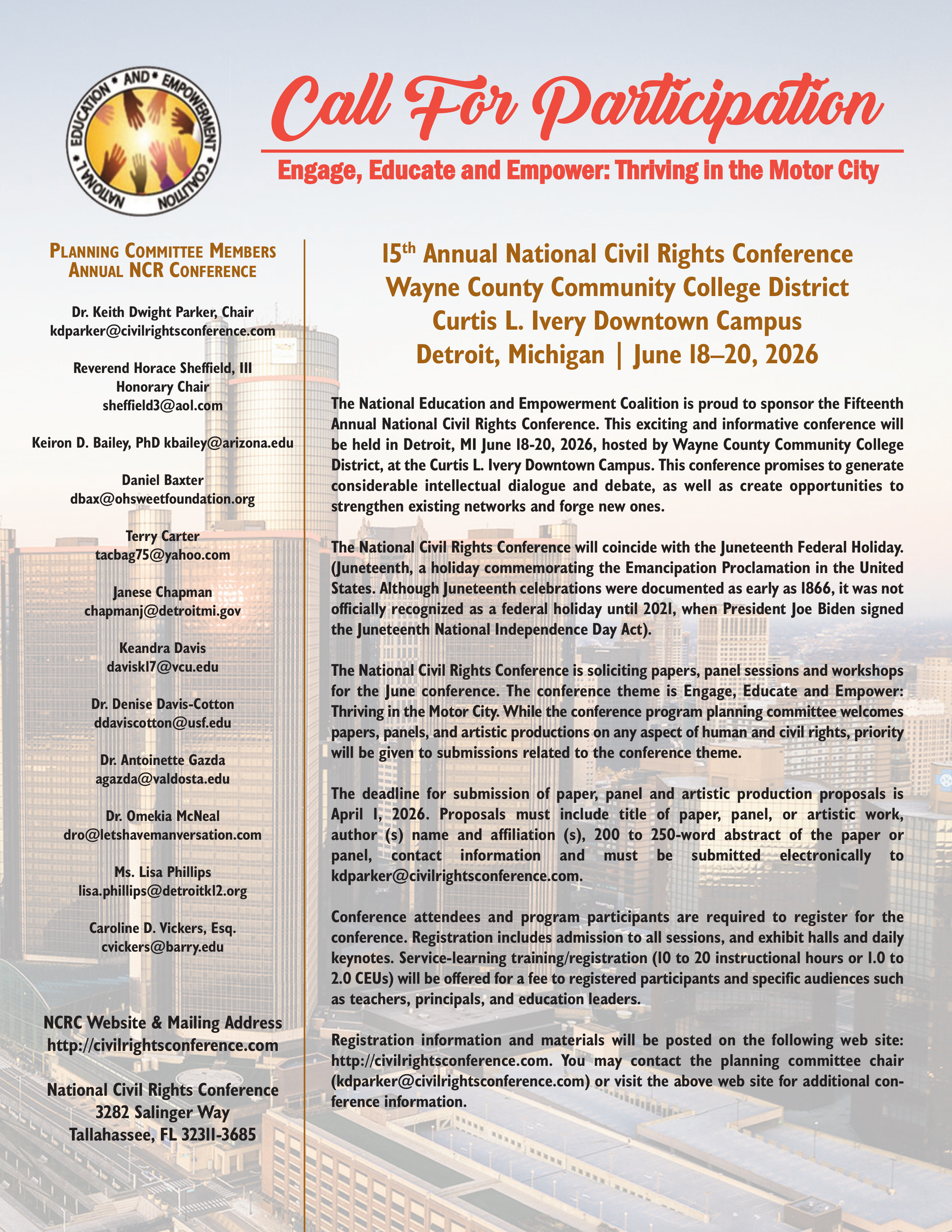 The Planning Committee for the 2026 National Civil Rights Conference (hereafter NCRC) is inviting you to attend the June 18th - 20th Conference. The three-day Conference will convene in Detroit (MI) and will include [1] must-see sights and activities (i.e., Motown Museum, Detroit Institute of Arts, Specialty Museums), [2] thought-provoking presentations and panel discussions from professionals and practitioners interested in human and civil rights, social justice, STEAM education, civic and global engagement, technology literacy, leadership development, silver rights and social equity, and [3] engaging workshops, artistic productions, innovative keynote speakers and opportunities for youth to participate in age-appropriate activities. Learn more